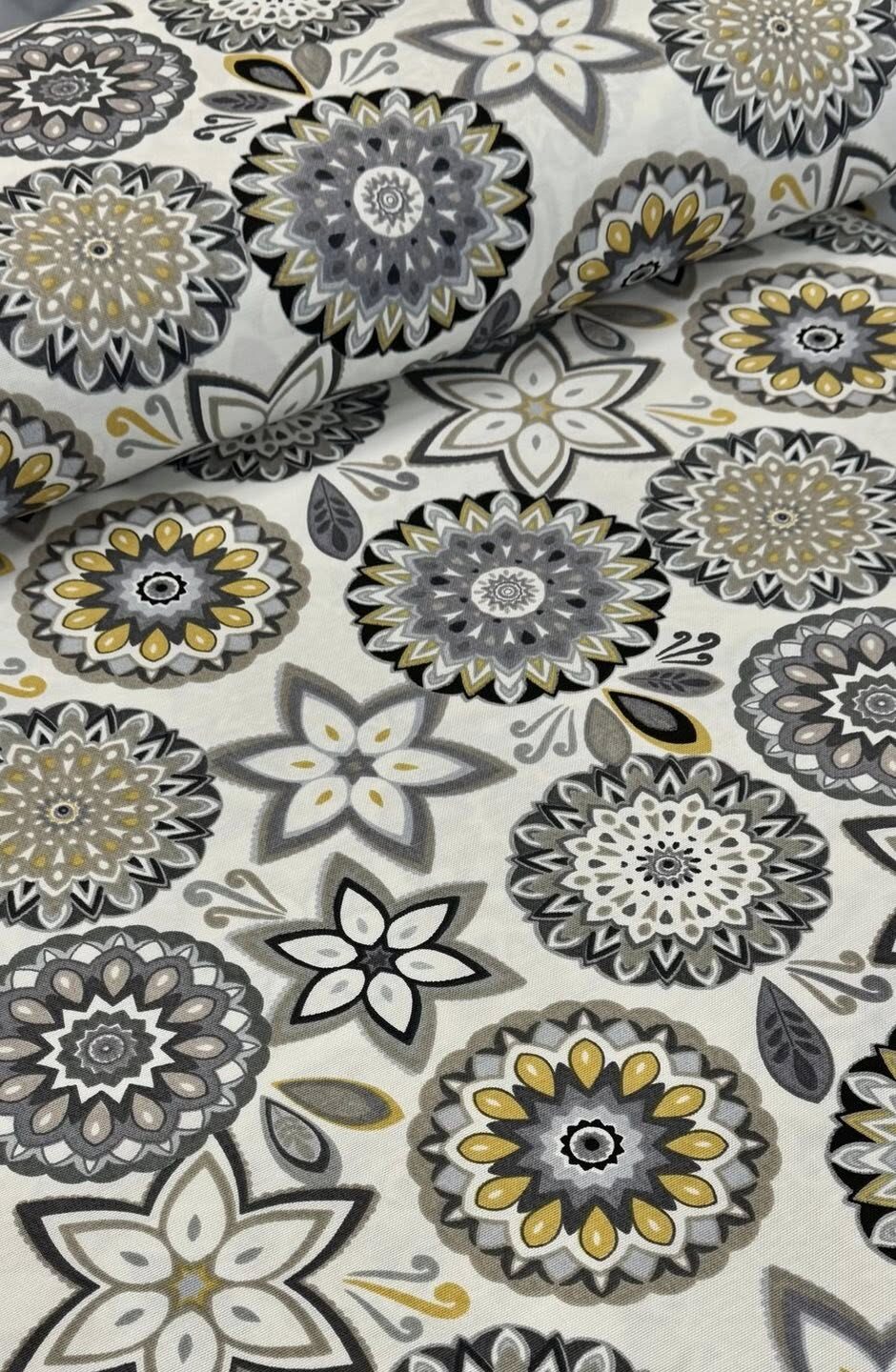Хидрофобирана покривка „Орнаменти“ – отблъсква течности, не позволява да попиват в плата и се почиства лесно от ежедневни петна. Подбираме внимателно висококачествени платове, на които разчитаме за красив вид и надеждна употреба. Десенът придава свеж, нежен акцент и стои елегантно на масата, като запазва модерен и универсален стил, който лесно се съчетава с различни интериори. Подходяща е както за ежедневна употреба, така и за специални поводи – семейни събирания, празнични вечери и по-официални мероприятия. Хидрофобната обработка ви дава време да реагирате при разливане – просто попивате с кърпа и масата остава подредена, без излишно търкане и притеснения. Може да бъде изработена по размер на клиента – необходимо е само да ни предоставите размерите на вашата маса, за да пасне прецизно и да пада красиво.