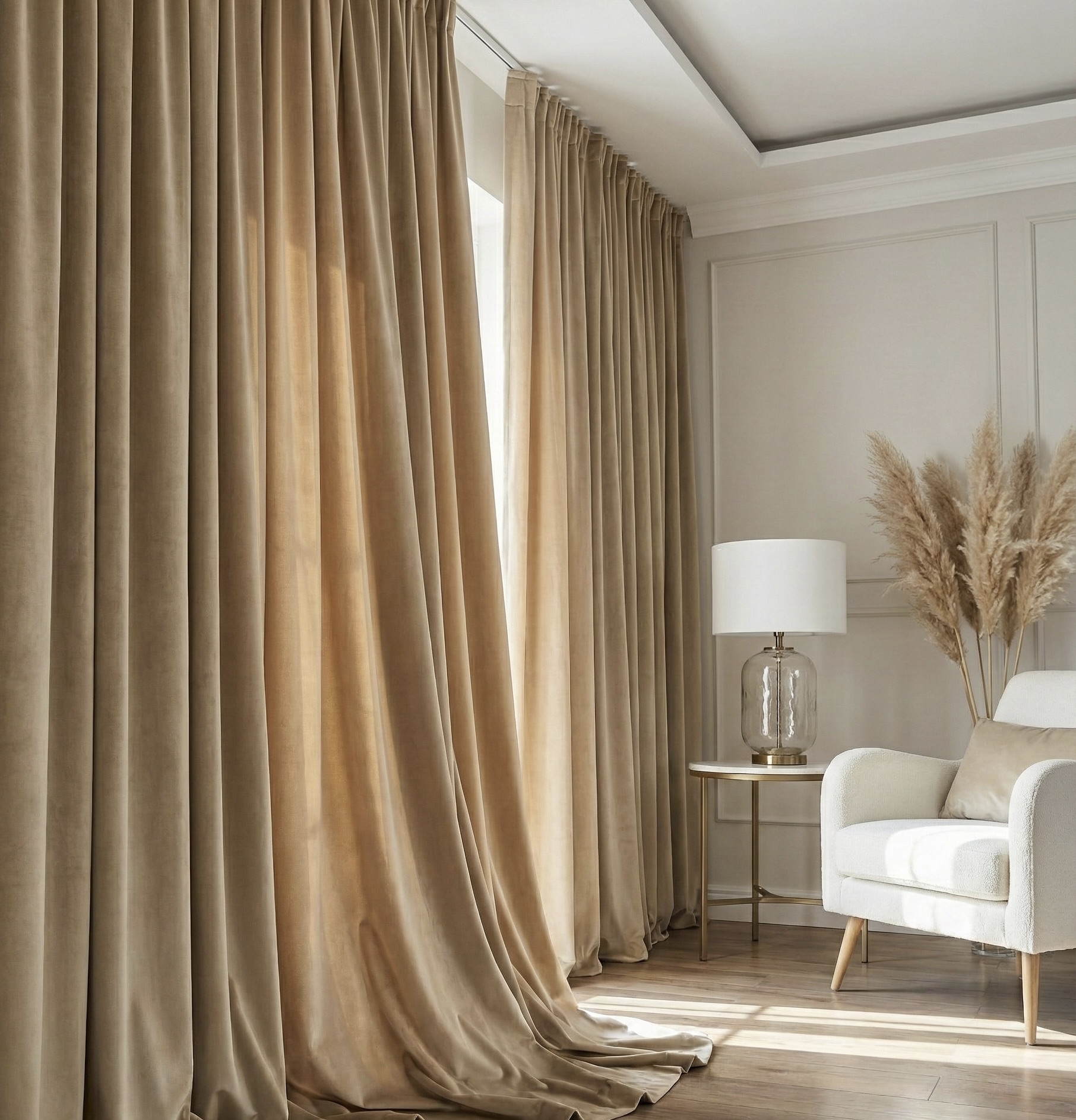 Елегантни и плътни велурени завеси в нежен бежов цвят. Изработени от висококачествен, мек велур с богата текстура, тези завеси добавят уют, топлина и изисканост във всяка стая, осигурявайки отлично затъмнение.